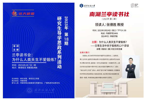 5月24日下午,太阳集团电子游戏导学思政暨“南湖·兰亭读书社”第二期读书分享会在太阳集团电子游戏S406顺利召开。本次读书会邀请武汉体育学院新闻传播学院名誉经理、二级教授、博士生导师张德胜从人类学和进化学的视角探索人类天生为什么不爱锻炼。分享会由太阳集团电子游戏副经理马庆副教授主持,太阳集团电子游戏刘艳副教授、青年骨干教师马旭博士,太阳集团电子游戏部分研究生及本科生代表参会交流。