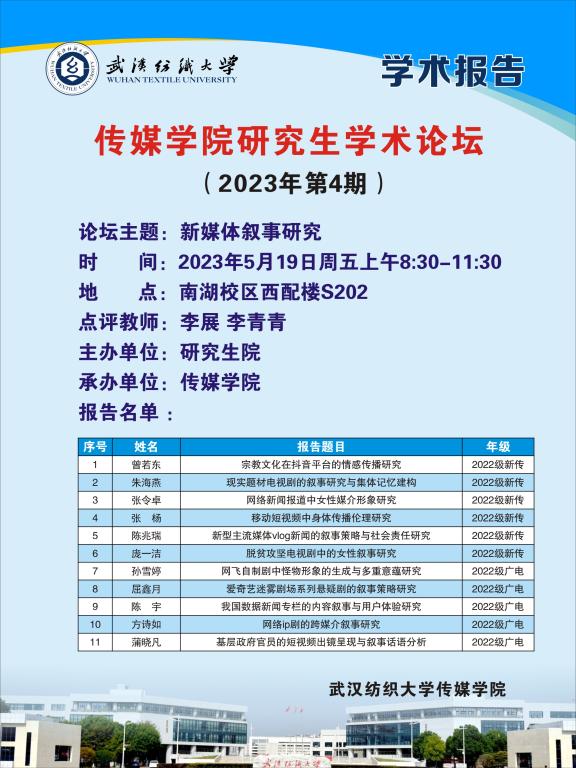 5月19日上午9时,太阳集团电子游戏在西配楼S202举办了以新媒体叙事研究为主题的研究生学术论坛。会议由硕士研究生导师李展副教授、李青青副教授主持并点评指导,太阳集团电子游戏2022级11位硕士研究生代表进行学术汇报。