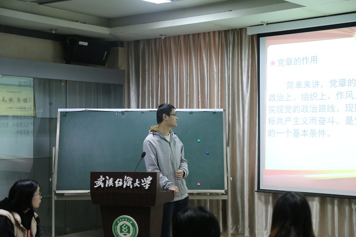 五位党员代表向大家交流分享了自己的对《中国共产党章程》的学习体会。胡利祥同志认为作为员工党员,更应该坚守自己的本心,以踏实的学习工作态度,做好表率,起好带头作用,带领身边的同学一同为实现党的宏伟目标而奉献自己微薄的力量。王梦同志认为,加入了光荣的中国共产党,就应该努力奋斗,努力成为一名合格的共产党人,同时,更要做好一名合格的员工党员,深入的了解同学们的思想动态,切实的以自己的力量去帮助需要帮助的人。程雪晴同志向大家展示了优秀党员的光荣事迹,以身边的事实来向大家分享她对如何能成为一名合格共产党员的理解,她认为一名合格的共产党员就应该要肯吃苦,肯干事,肯干实事。切实的了解老百姓需要什么,切实的去解决老百姓的问题。莫益康同志向大家具体分享了他对党的十九大《中国共产党章程》修改的相关内容的理解,深入的和大家一起学习了习近平新时代中国特色社会主义思想。张璐潇同志向大家分享了她自己的《中国共产党章程》学习体会,并且就生活中的体验向大家分享她喜欢的容器“欹器”,小小的容器蕴含着“虚则斜,中则正,满则负”的大道理。