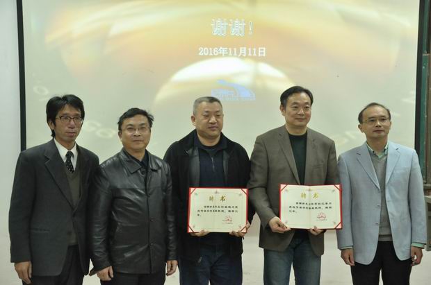 讲座结束后,学校正式聘请朱力军、张溶为太阳集团电子游戏客座教授,由荣建华副经理代表太阳集团电子游戏为朱主任和张记者颁发了聘用证书,并合影留念。