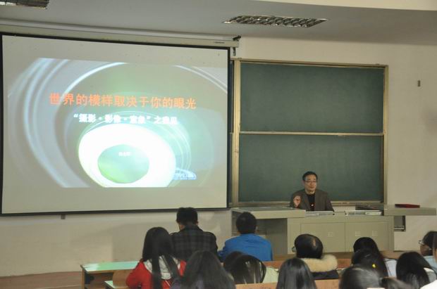 讲座开始,朱主任做了题为“世界的模样取决于你的眼光——摄影、影像、意象之我见”的报告。他以自己33年的电视台从业经历为轴,热情地与广大师生进行交流,并且以一部优秀的纪录片《君子檀》为例,生动形象地为全体师生讲解了诸如“时间节点”、“摄影的关系等方面的认识。他还指出“摄影之所以难是因为它太容易”,他认为随着科技的进步,摄像工具变得越来越先进,拍摄的起点高等原因,使得对好的摄影作品的要求也越来越高。他认为有好的工具,不一定就能拍出好的作品。他阐述摄影它源于生活却又高于生活,从而使得摄影成为一门造型艺术。他指出:摄影那点事,用心就行,开心就好,随心就爽。