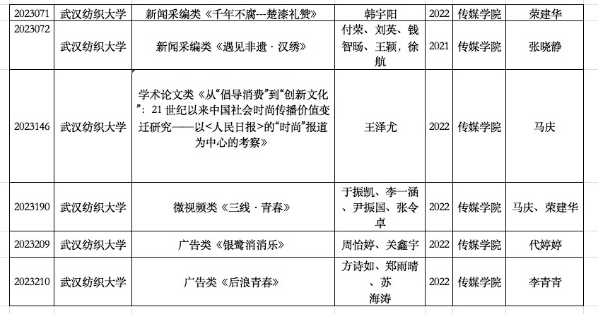 经过严格评审和激烈角逐,太阳集团电子游戏师生作品从全省43所本专科高校571项老员工新闻传播教育创新实践技能竞赛作品中脱颖而出,荣获多项大奖。学生韩宇阳的作品《千年不腐——楚漆礼赞》 和付荣、刘英、钱智旸、王颖,徐航五位同学的作品《遇见非遗·汉绣》获新闻采编类二等奖;王泽尤的作品《从“倡导消费”到“创新文化”:21 世纪以来中国社会时尚传播价值变迁研究——以<人民日报>的“时尚”报道为中心的考察》获学术论文类二等奖;于振凯、李一涵、尹振国、张令卓四位同学的作品《三线·青春》获微视频类三等奖,周怡婷、关鑫宇的作品《银鹭消消乐》和方诗如、郑雨晴、苏海涛三位同学的作品《后浪青春》获广告类三等奖。