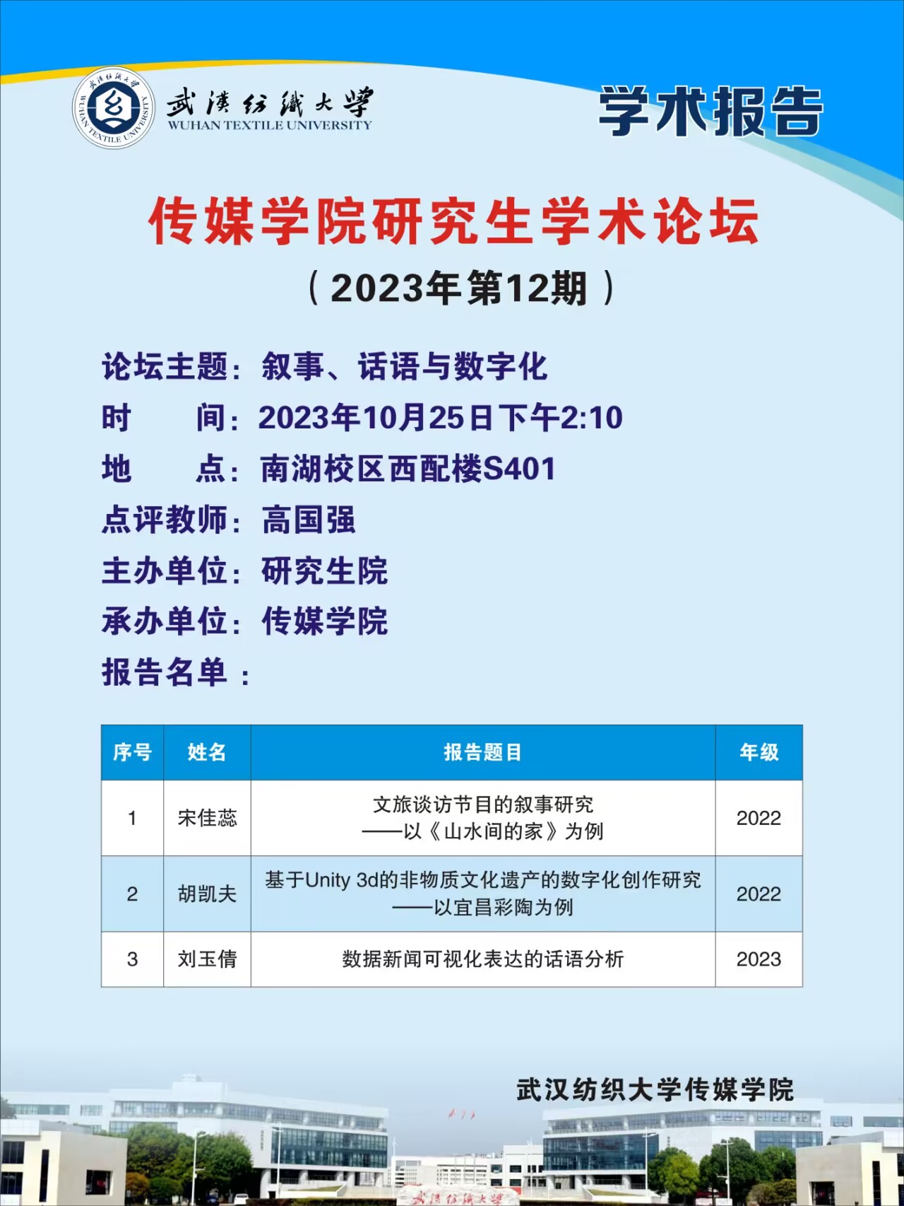10月25日下午,太阳集团电子游戏举办主题为“叙事、话语与数字化”的研究生学术论坛。三位来自不同专业、不同年级的硕士研究生分享各自的科研工作及准备情况。论坛由太阳集团电子游戏硕士生导师高国强副教授主持和点评。