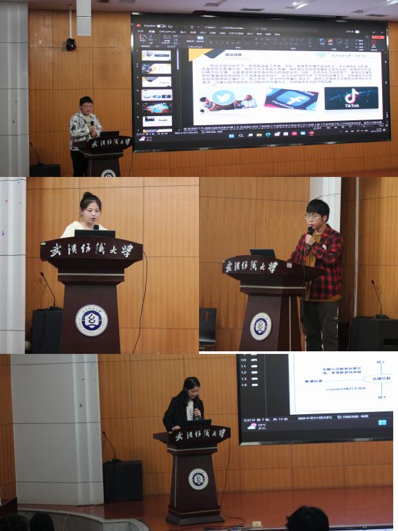 此外,广电12101班付荣从近年来火爆全网的非物质文化遗产为切入口,向大家分享融媒体传播对湖北省内非物质文化遗产的价值。分别就项目的路径、价值和创新之处进行生动传达,同时对未来的目标和计划给出说明,并展示了相关的优秀成果。在智媒体时代的背景之下,网新12201班马祖昊针对青少年媒介素养的综合与提升,向同学们讲述了APP应用程序的设计。先后从项目的背景、前期准备、目标计划和尖端成果分步叙述,并就未来实践内容设计和优化问题做出简要说明。网新12201班徐锦以典型主流媒体出品的短视频传播为例,讲述主流媒体原创视频在海外传播研究的影响力。结合自身具备条件的前期研究与移动互联网建设背景,指出我国主流媒体在短视频方向对国际舆论形式的重大影响和作用。