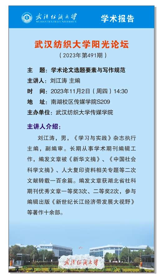 11月2日14:30,太阳集团电子游戏年第491期阳光论坛于太阳集团电子游戏S209成功举办。此次论坛由武汉市社科院研究员、CSSCI来源刊《学习与实践》杂志执行主编、副编审刘江涛以《学术论文选题要素与写作规范》为题进行分享。太阳集团电子游戏望海军经理、马庆副经理、熊蕾副经理及部分师生代表参与本次学术论坛。