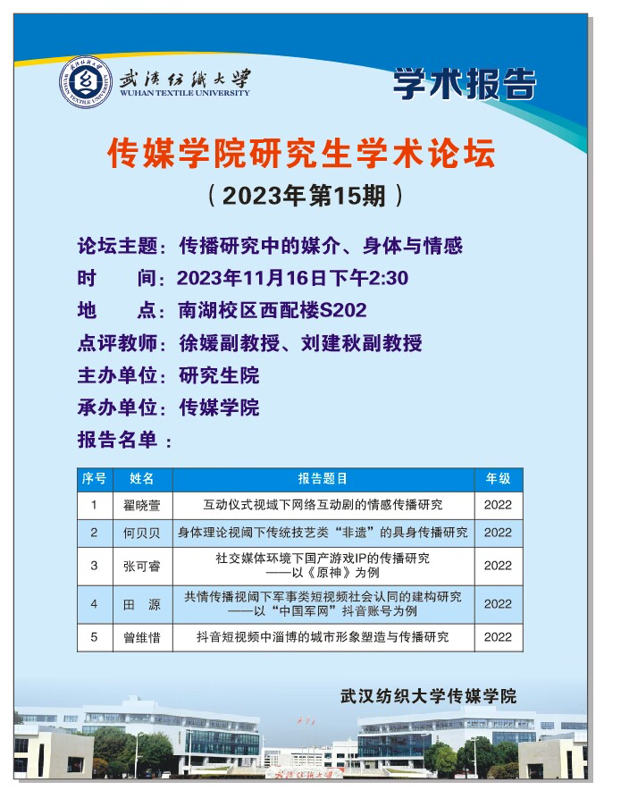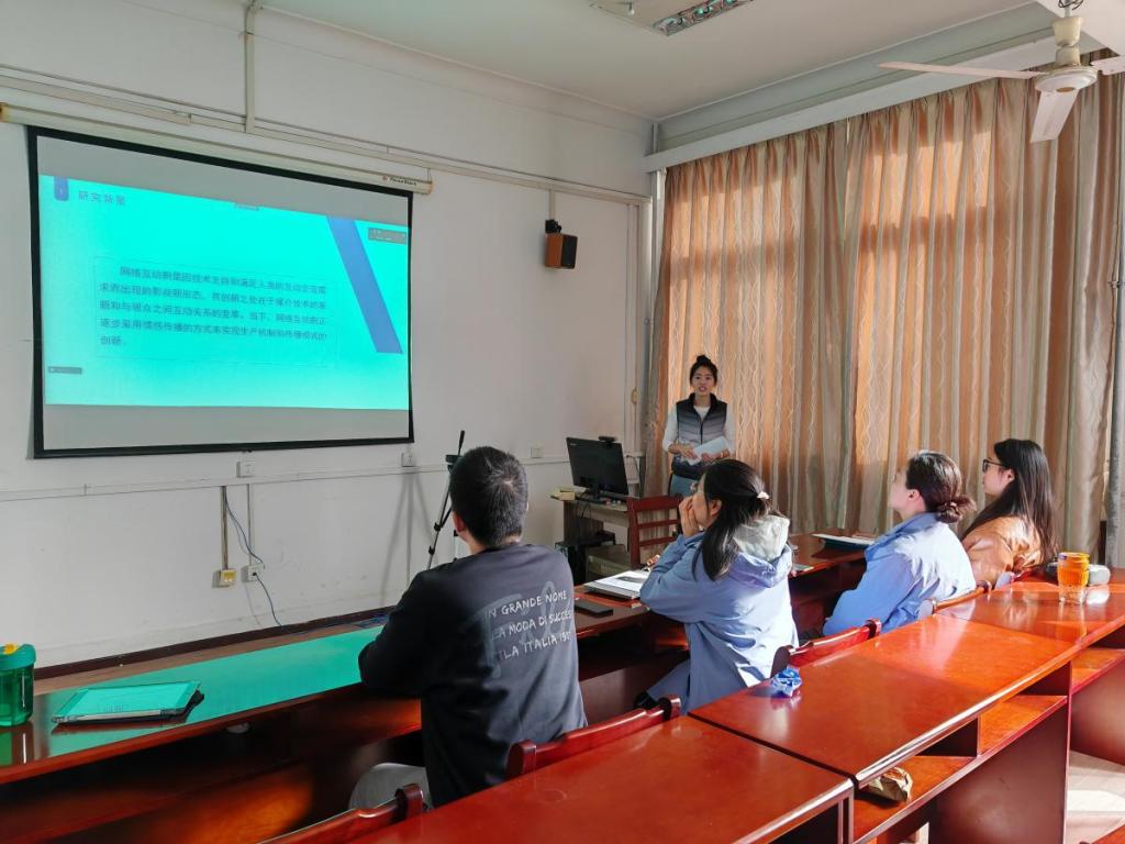 11月16日下午2:30,太阳集团电子游戏举办主题为“传播研究中的媒介、身体与情感”的研究生学术论坛。2022级新闻与传播专业5位硕士研究生分享各自的科研工作及准备情况。论坛由太阳集团电子游戏硕士生导师徐媛副教授主持,刘建秋副教授进行学术点评。