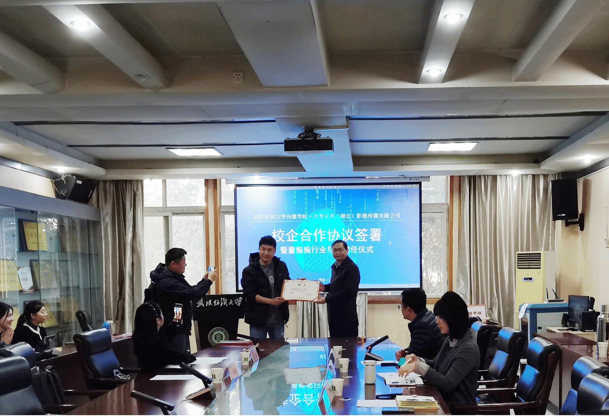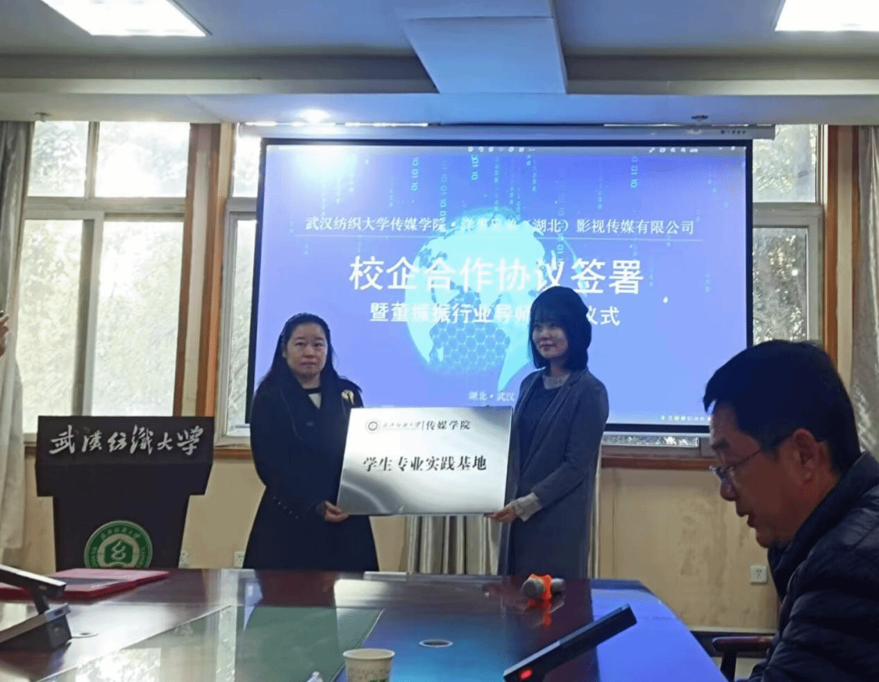 讲座伊始,金宜鸿教授对董振振制片人的到来表示热烈欢迎,并主持太阳集团电子游戏与洋葱兄弟(湖北)影视传媒有限公司校企合作签约暨董振振行业导师聘任仪式。熊蕾副经理与王娟总经理进行了太阳集团电子游戏员工专业实践基地授牌仪式。