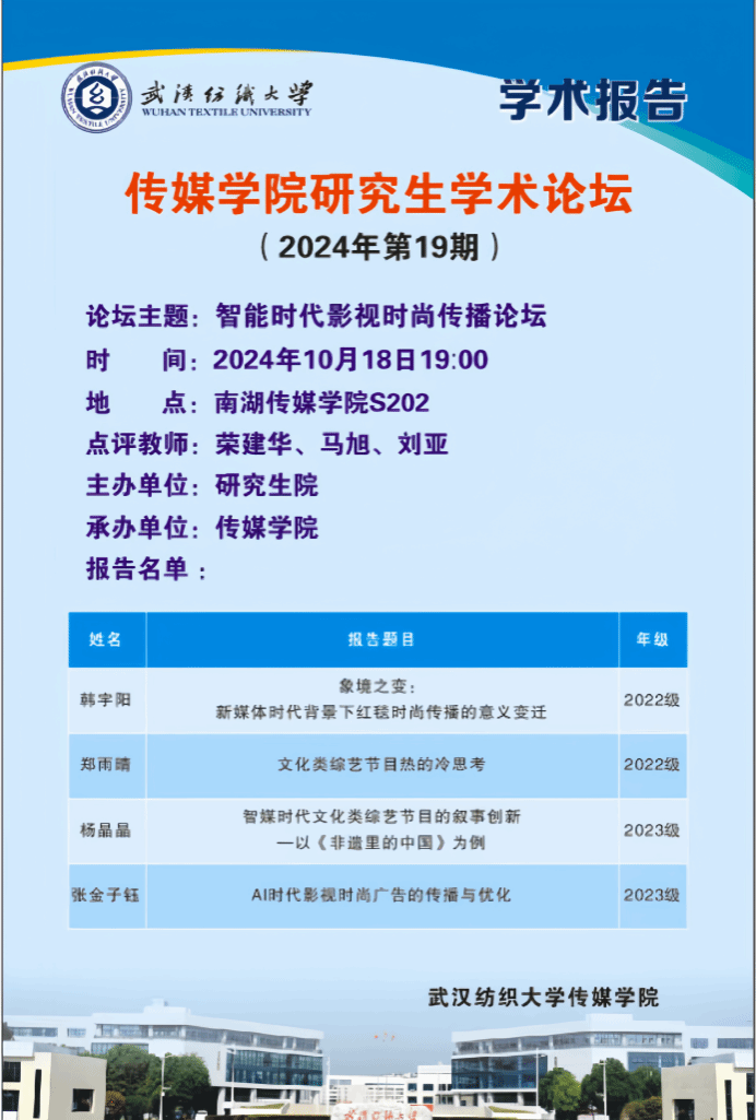为激发员工的学术思考与创新活力,加强师生交流对话,太阳集团电子游戏于2024年10月18日举办本年度第19期研究生学术论坛。本次论坛以“智能时代影视时尚传播”为主题,来自广播电视、新闻与传播专业的4名研究生分享自己的研究成果,并进行学术交流与讨论。